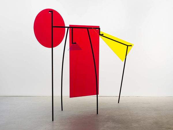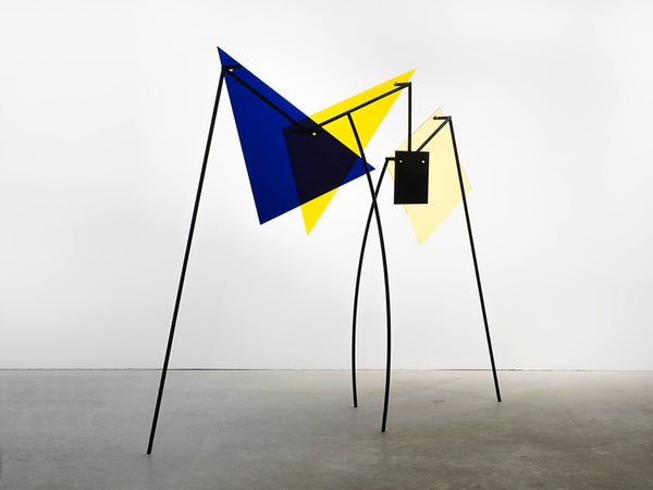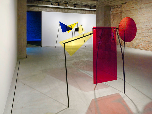 The sculptures – metal structures with the same colored Perspex shapes suspended from them – are memorials of the different compositions formed by the performers in the film. Functioning as «fixatives» of the shapes’ meetings, these visual statements form possible interpretations and narratives. Moreover the series synthesizes many aspects of the history of abstract sculpture, including Minimalism, Kinetic Art and Constructivism.