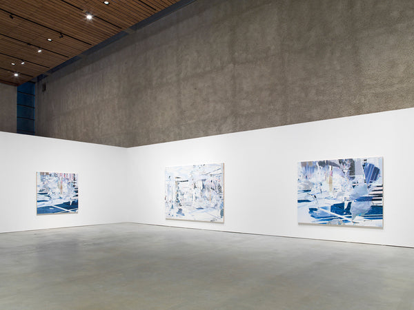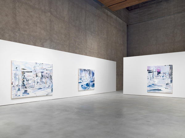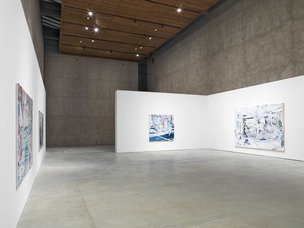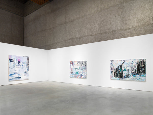 Despite their complexity and overwhelming, puzzle-like juxtaposition and superposition of different, often very small forms, the works radiate a deep sense of calm, acting as silent invitations to contemplation. They feature urban, often futuristic scenes reminiscent of airport terminals, pedestrian zones and museum halls, yet they are fragmented and overlapping, they appear both sparse and dense. Architectural structures collide with schematic representations of vegetation and human figures, large monochrome planes are superimposed with detailed, crystalline structures that cover large sections of the image like abstract gaps that nevertheless take up space, recalling digital aesthetics.